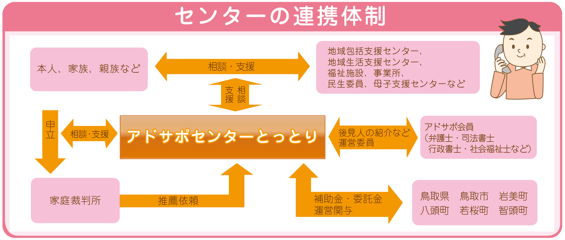アドサポセンターとっとりでは、行政からの委託や補助金を受け、成年後見制度を活用した権利擁護事業を行っています。